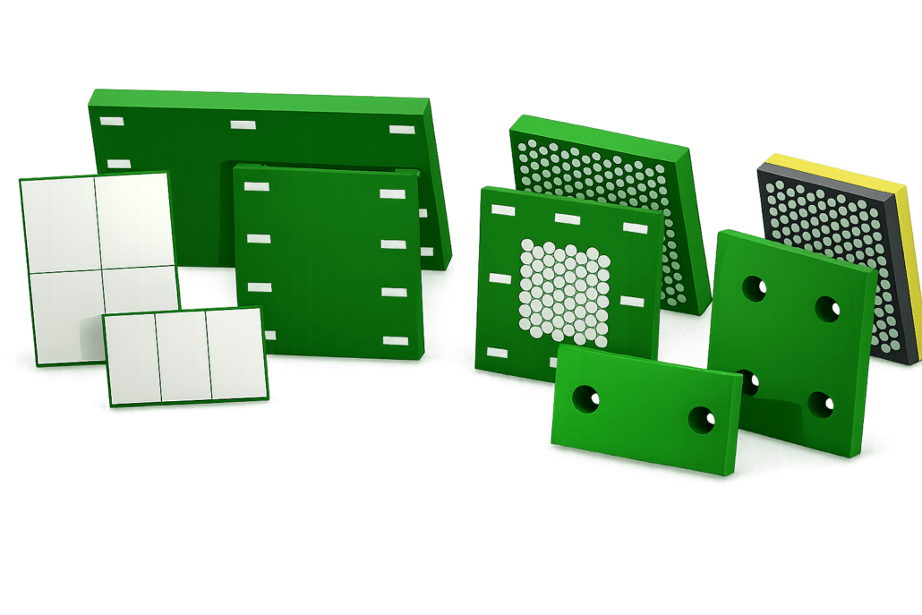 - Recubrimientos y componentes de poliuretano para alta abrasión (limpiadores, placas de desgaste, faldones)